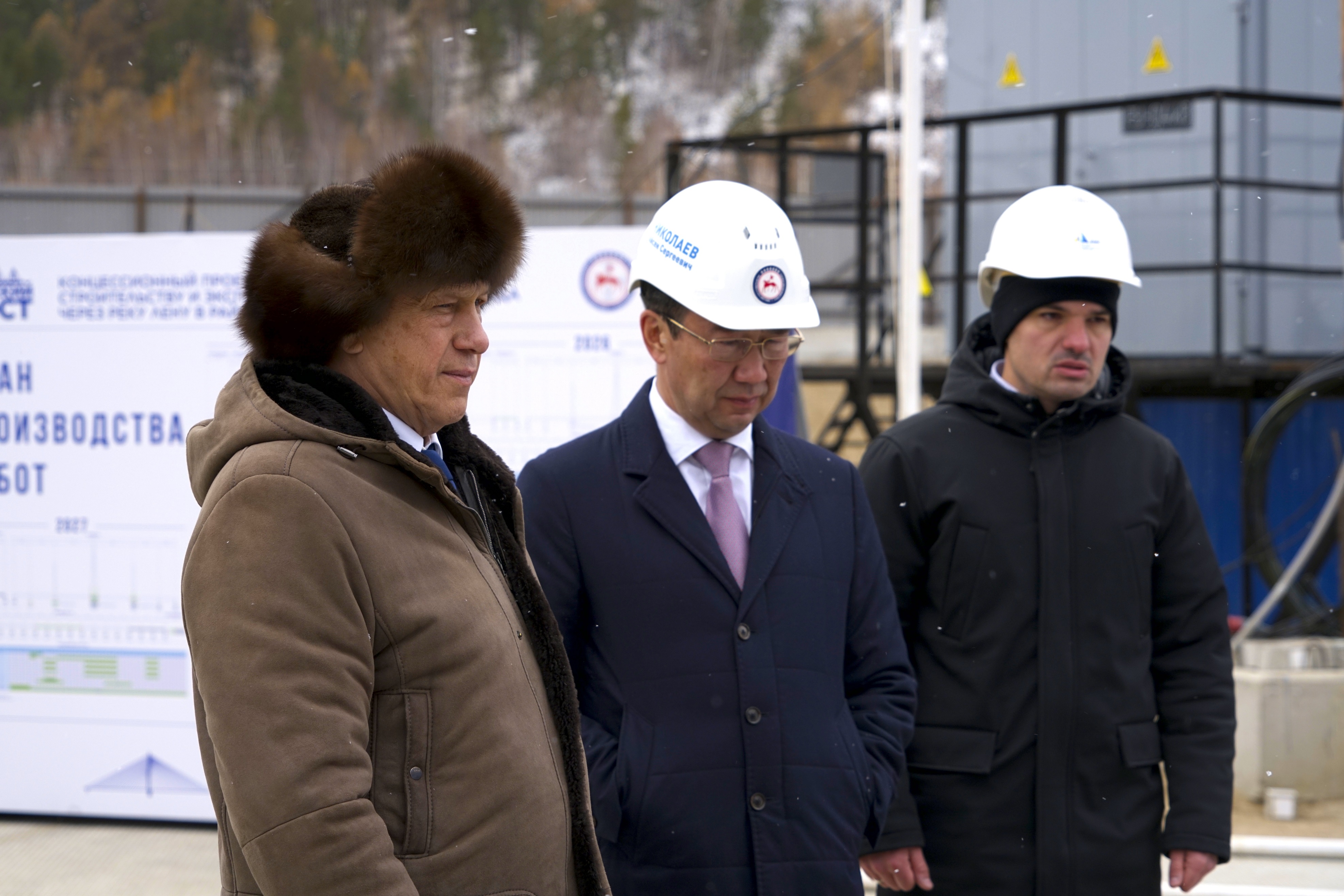 Во время рабочей поездки в город Якутск Заместитель Председателя Правительства Российской Федерации – полномочный представитель Президента РФ в Дальневосточном федеральном округе Юрий Трутнев вместе с Главой Республики Саха (Якутия) Айсеном Николаевым посетили строительную площадку будущего мостового перехода через реку Лену.