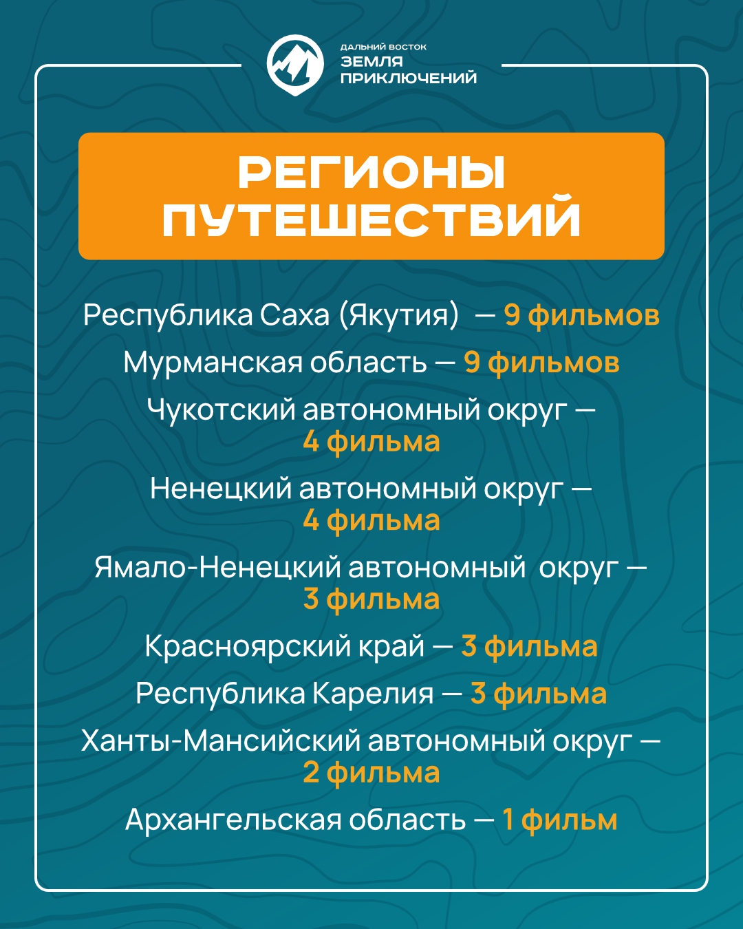 По количеству фильмов лидируют Сахалинская область – 129 видеоработ, Хабаровский край – 49 фильмов, Приморский край – 38 фильмов. О путешествиях по Амурской области снято 26 видеороликов, по Еврейской автономной области – 21 фильм, Камчатскому краю – 16 фильмов, по Республике Бурятия – 13 видеоработ. О туристических маршрутах по Магаданской области и Забайкальскому краю участники прислали по 11 фильмов, по Республике Саха (Якутия) – 9, по Чукотскому автономному округу – 4 фильма.