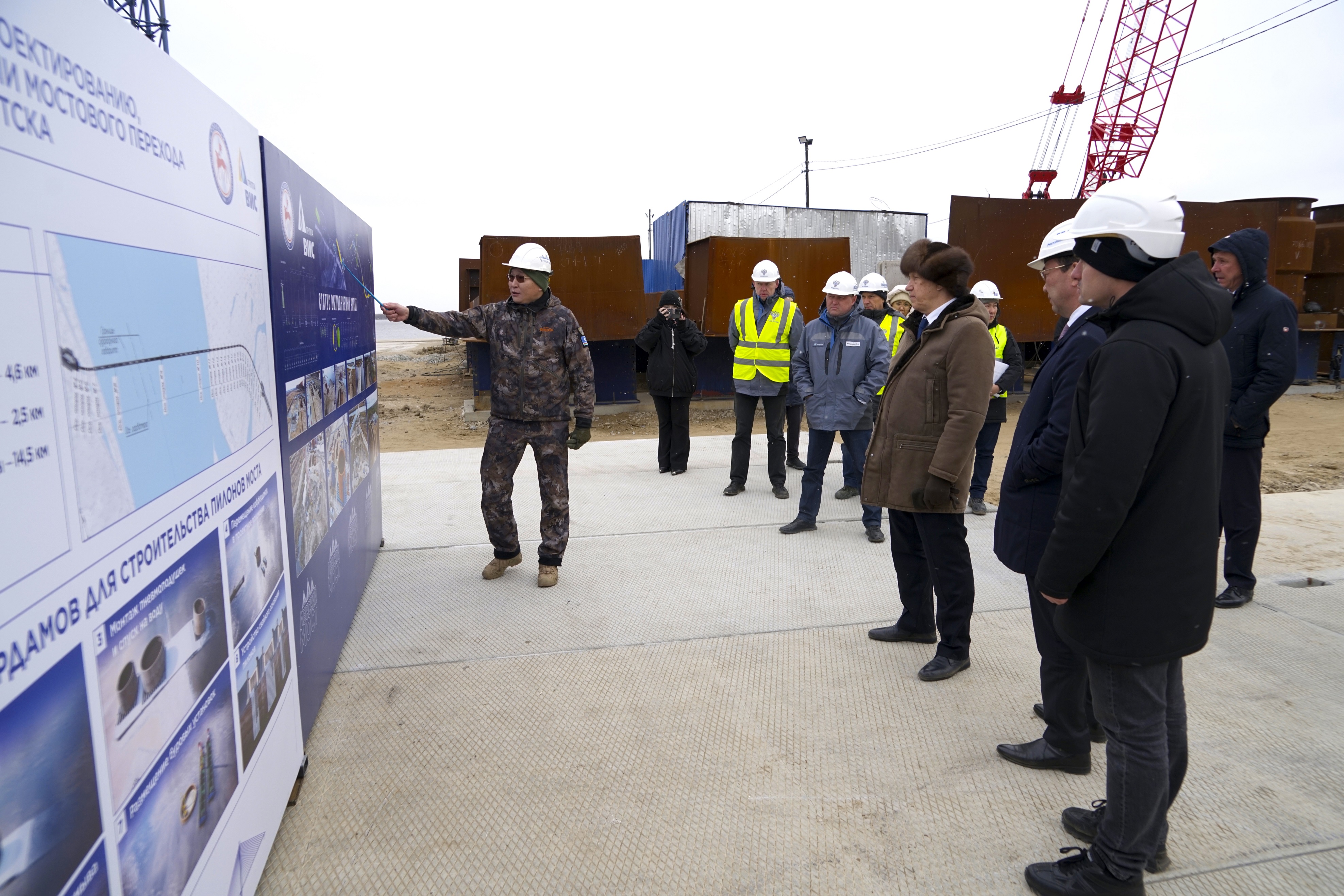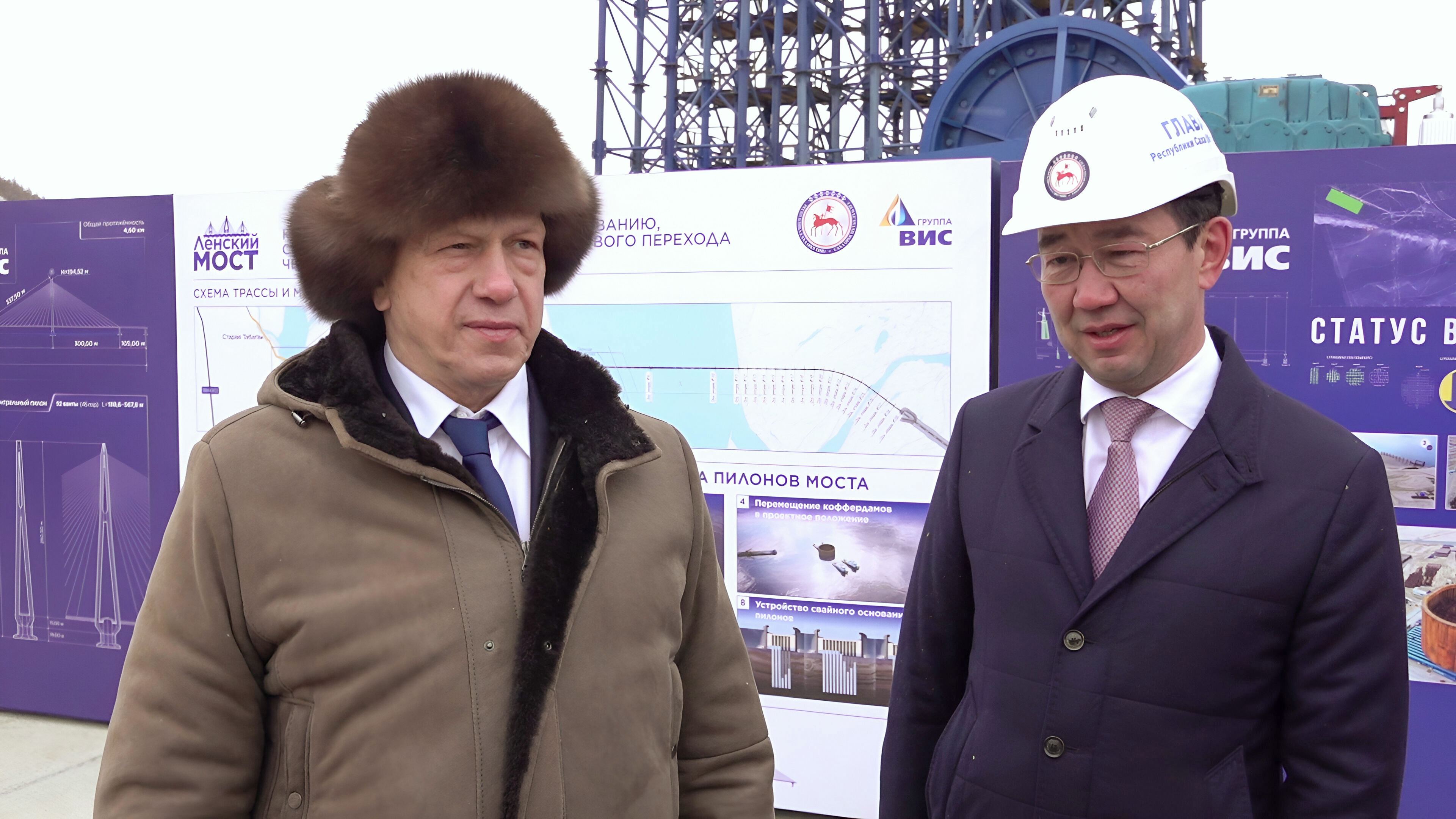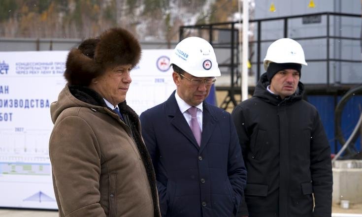 Во время рабочей поездки в город Якутск Заместитель Председателя Правительства Российской Федерации – полномочный представитель Президента РФ в Дальневосточном федеральном округе Юрий Трутнев вместе с Главой Республики Саха (Якутия) Айсеном Николаевым посетили строительную площадку будущего мостового перехода через реку Лену.