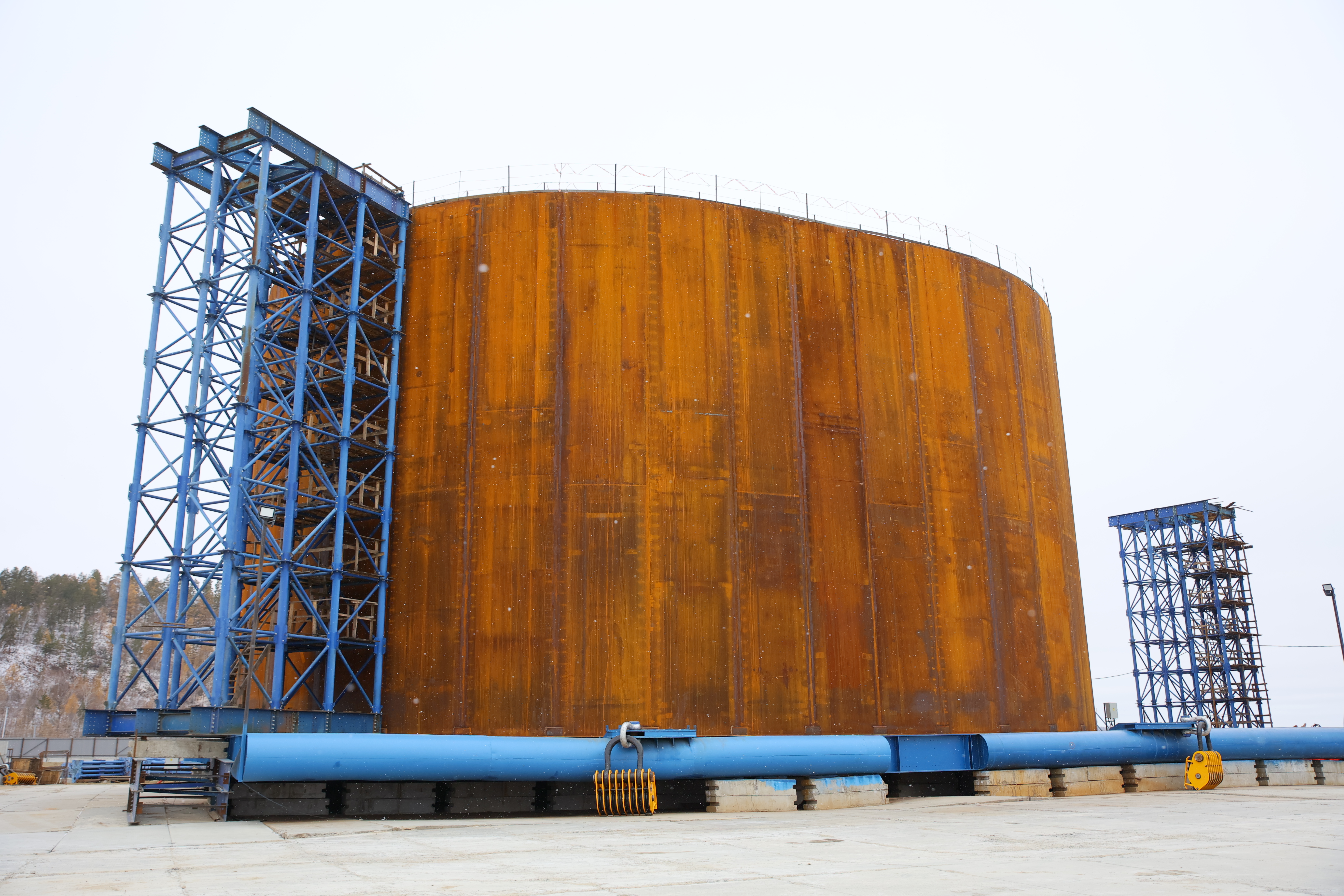 Параллельно ведется укрупнительная сборка стеновых блоков второго коффердама, производство армокаркасов для буронабивных свай, обустройство рабочих городков и размещение технологического оборудования.