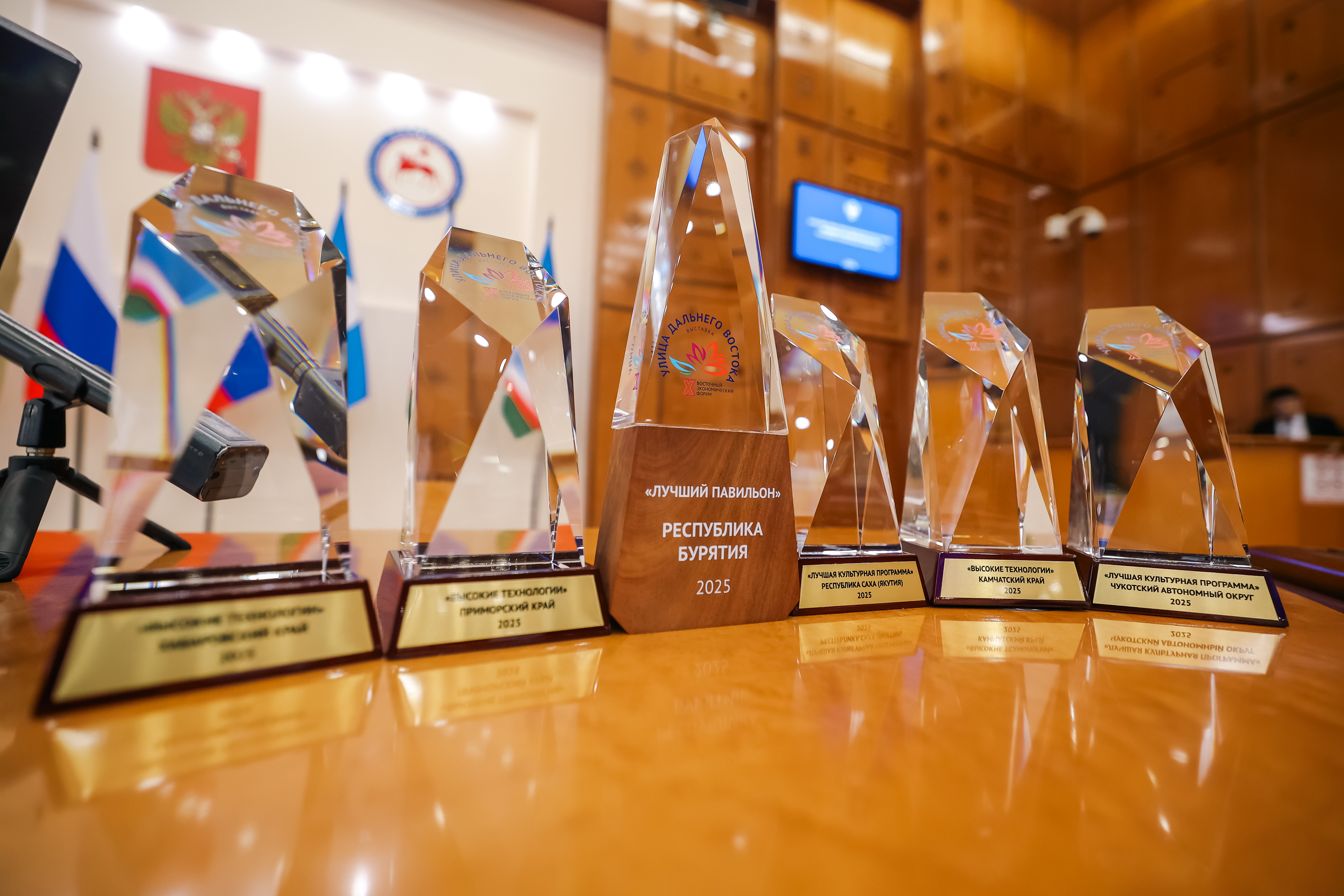 Наградами отмечены еще пять регионов. В номинации «Высокие технологии» победили павильоны Камчатки, Хабаровского края и Приморья. Лучшими среди дальневосточных регионов в номинации «Лучшая культурная программа» стали Якутия и Чукотка. Накануне Юрий Трутнев наградил Центр развития военно-спортивной подготовки и патриотического воспитания молодежи «ВОИН», победивший в номинации «Лучший отраслевой павильон».
