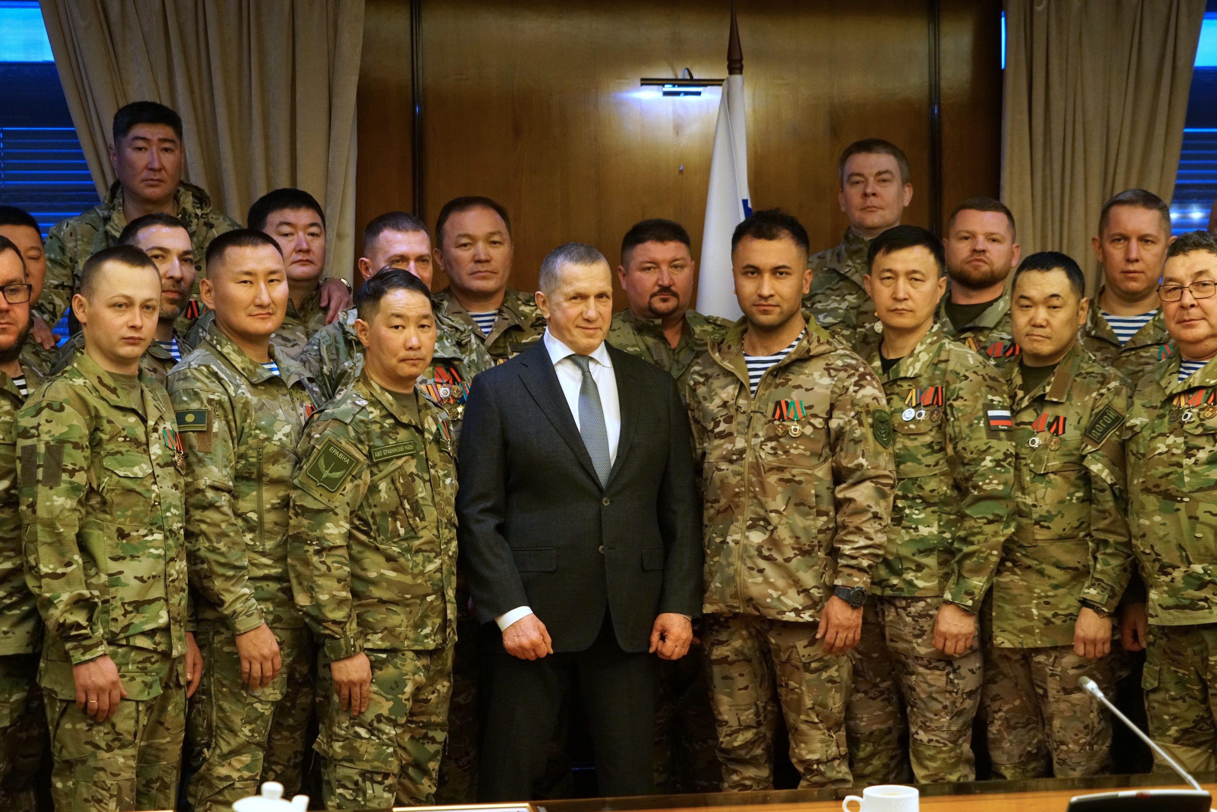 Заместитель Председателя Правительства РФ – полномочный представитель Президента РФ в ДФО Юрий Трутнев провёл встречу с отрядом добровольцев государственных гражданских служащих, вернувшихся с СВО по окончанию контракта.